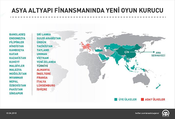 Çin Maliye Bakanlığının internet sitesinde yer alan açıklamaya göre, Türkiye'nin, Asya Altyapı Yatırım Bankasına kurucu üyelik için 26 Mart'ta yaptığı başvuru sonuçlandırıldı. Bankanın kurucu üye sayısı, Türkiye'nin de kabul edilmesiyle 38’e yükseldi. Bankanın kurucu üyeleri, 10 Nisan itibariyle şu ülkelerden oluştu: