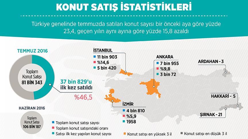 Buna göre, ülke genelinde temmuzda satılan konut sayısı, bir önceki aya göre yüzde 23,4, geçen yılın aynı ayına göre de yüzde 15,8 azalarak 81 bin 343 oldu. İstanbul 11 bin 903 konut satışı ile en yüksek paya (yüzde 14,6) sahip oldu. Satış sayılarına göre İstanbul’u, 7 bin 955 konut satışı (yüzde 9,8) ile Ankara, 4 bin 810 konut satışı (yüzde 5,9) ile İzmir izledi. Konut satış sayısının düşük olduğu iller sırasıyla 3 konut ile Ardahan, 5 konut ile Hakkari ve 21 konut ile Şırnak olarak kaydedildi.
