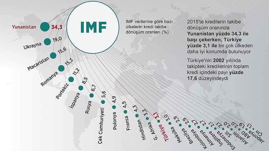 AA muhabirinin Bankacılık Düzenleme ve Denetleme Kurumu (BDDK) ve IMF'nin 2015 verilerinden derlediği bilgilere göre, kredilerin takibe dönüşüm oranında Yunanistan yüzde 34,3 ile başı çekti. Bu ülkeyi yüzde 19 ile Ukranya, yüzde 15,6 ile Macaristan, yüzde 15,3 ile Romanya takip ederken, takipteki kredilerin toplam krediler içindeki payı Portekiz'de yüzde 11,2'yi buldu.