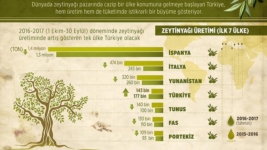 Merkezi Madrid’de bulunan Uluslararası Zeytin Konseyi raporunda, 1 Ekim 2016-30 Eylül 2017 üretim döneminde bir önceki döneme göre zeytinyağı üretiminde artış gösterecek tek ülkenin Türkiye olacağı, söz konusu dönemde Türkiye'nin, zeytinyağı üretimini 143 bin tondan 177 bin tona çıkaracağı, diğer üretici ülkelerde ise düşüş görüleceği belirtildi.