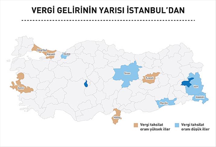 Söz konusu dönemde vergilerin yüzde 77,7'si İstanbul, Ankara, Kocaeli ve İzmir'den toplandı. İstanbul, devletin kasasına giren her 100 liralık verginin 46,07 lirasını tek başına karşıladı. İstanbul, 185 milyar lira ile bütçeye en fazla katkı sağlayan il oldu.