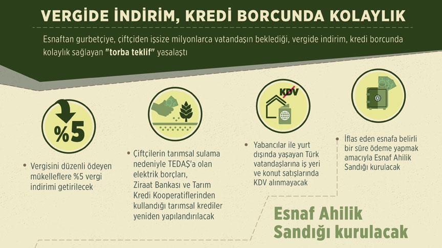 Yasa, çiftçilere de kolaylık sağlıyor, çiftçilerin Ziraat Bankası ve Tarım Kredi Kooperatiflerinden kullandığı tarımsal krediler yeniden yapılandırılıyor. 31 Aralık 2016 tarihi itibarıyla takibe düşen tarımsal kredi alacaklarını yeniden yapılandırmak için, 3 ay içinde banka veya kooperatife başvuruda bulunulması gerekecek.