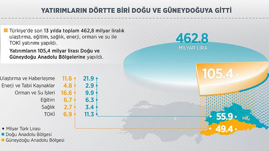 Türkiye'de son 13 yılda, ulaştırma, eğitim, sağlık, enerji, orman ve su ile TOKİ yatırımlarına toplam 462,8 milyar lira ayrıldı, bunun dörtte biri Doğu ve Güneydoğu Anadolu bölgelerine tahsis edildi.ZEYNEP AKYIL
