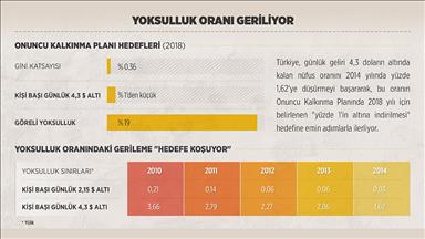 Plana göre, gelir dağılımında adaletin sağlanması ve yoksullukla mücadele alanında önemli ilerlemeler kaydedildi. Bu kapsamda, günlük geliri 4,3 doların altında kalan nüfusun oranı 2006 yılındaki yüzde 3,3 seviyesinden 2011 yılında yüzde 2,8'e düştü. Bu yıl sonu itibarıyla yüzde 2,3, 2018'de ise yüzde 1'in altına indirilmesi hedefleniyor.