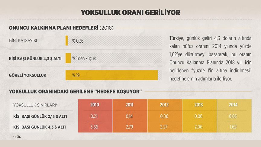 Türkiye'de cari Satınalma Gücü Paritesi'ne göre kişi başı günlük harcaması 4,3 doların altında kalanların oranı 2014'te yüzde 1,62'ye düşürülerek, Onuncu Kalkınma Planı hedefine yaklaşıldı.
