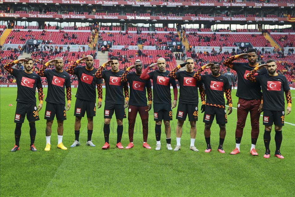Önünde Türk bayrağı, arkasında da "Mehmet" yazısının bulunduğu tişörtlerle ısınmaya çıkan Galatasaraylı futbolcular, asker selamı verdi.
