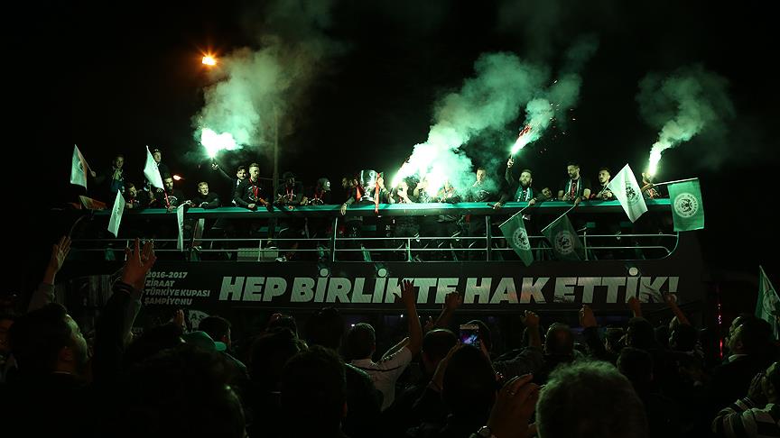 Yüksek Hızlı Trenle (YHT) Konya Garı'na gelen yeşil-beyazlı ekibi karşılayan kalabalık taraftar grubu takımları lehine slogan attı. Kupayı Konya'ya getiren futbolcularla hatıra fotoğrafı çektiren taraftarlar, ellerindeki bayrak ve meşalelerle kupa şampiyonluğunu kutladı.