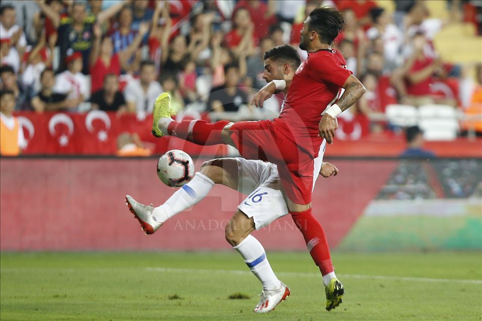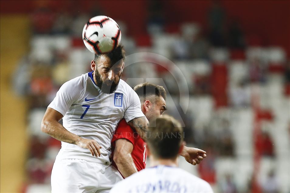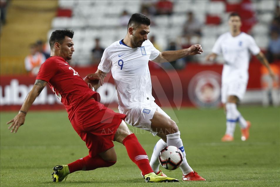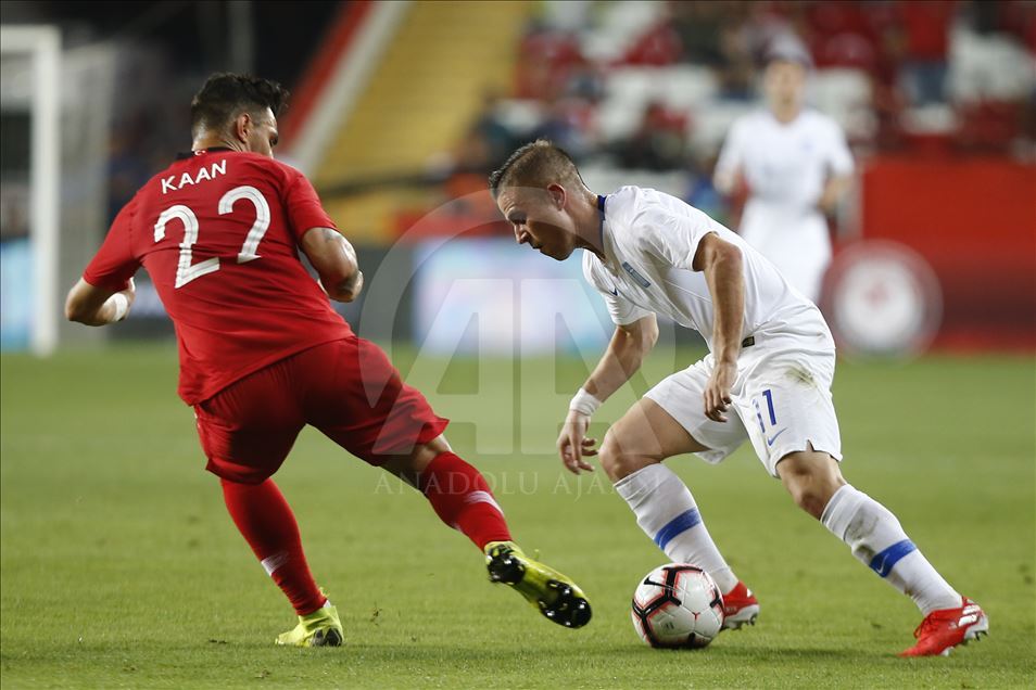 A Milli Futbol Takımı, özel maçta Yunanistan ile Antalya Stadı'nda karşı karşılaştı. Milli takım oyuncusu rakibi Cengiz Umut Meraş (13) ile Giorgos Masouras (16) mücadele etti. ( Mustafa Çiftçi - Anadolu Ajansı )