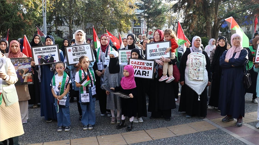 Türkiye ve Filistin bayraklarıyla üzerinde "İsrail terör örgütüdür", "Gazze'de soykırım var", "Filistin özgür olmadıkça hiçbirimiz özgür değiliz", "Gazze ölüyor", "Çocuklar ölürken susulmaz" ve "Netanyahu 21. Yüzyılın Hitleridir" yazan döviz ve pankartlar taşıyan kadın ve çocuklar, İsrail'e tepki gösterdi.