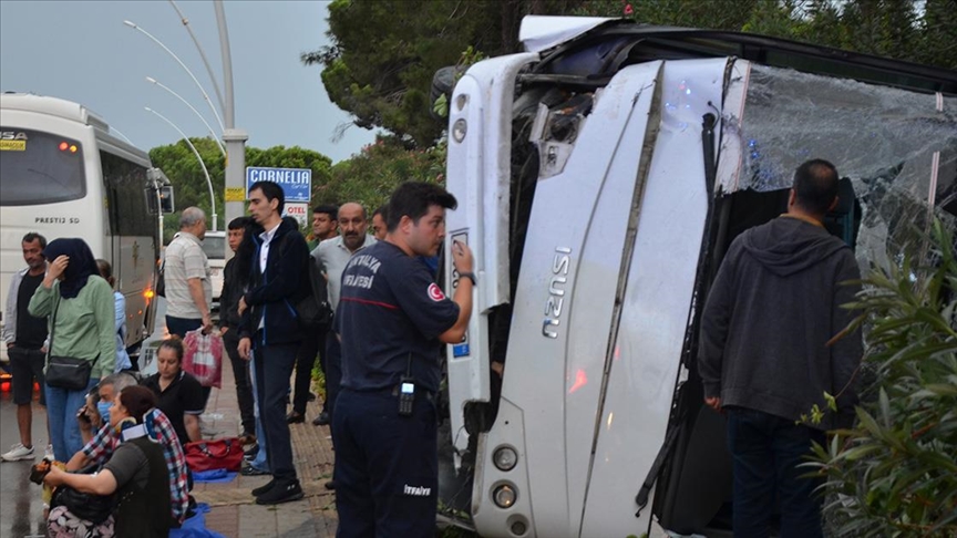 Belek Mahallesi Turizm Caddesi'nde A.T. idaresindeki 07 C 82127 plakalı servis midibüsü, sürücüsünün direksiyon hakimiyetini kaybetmesi sonucu devrilerek kaldırıma çarptı.