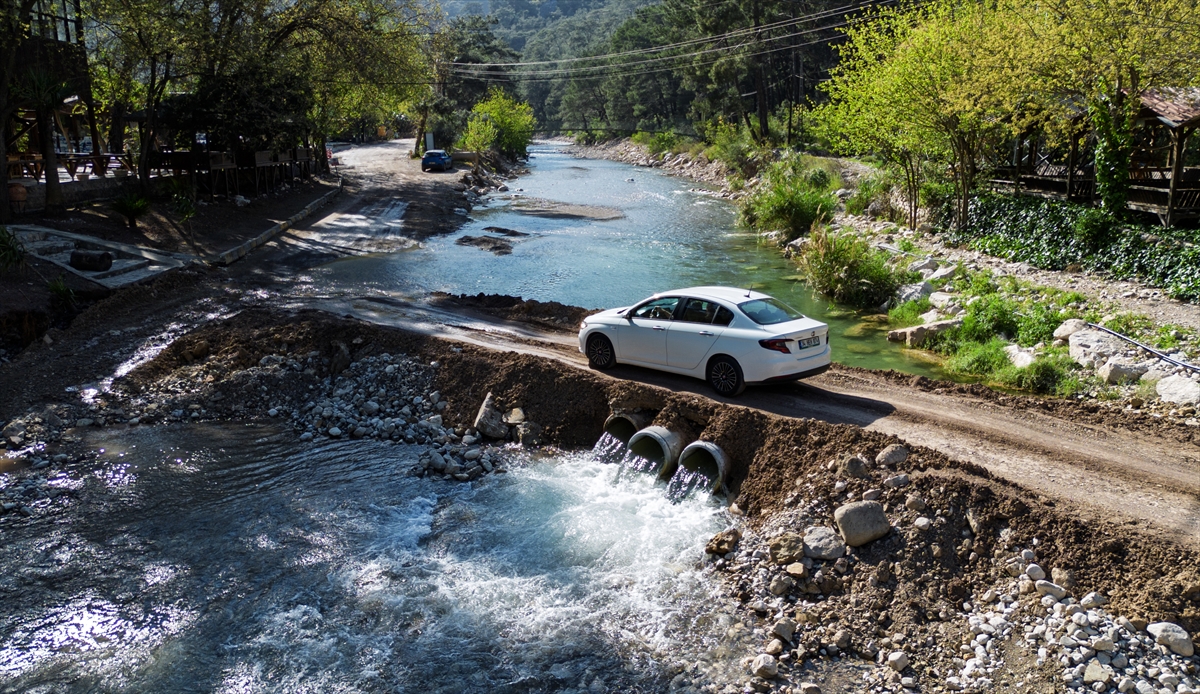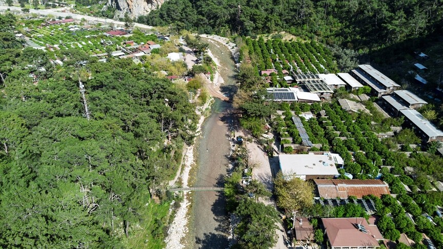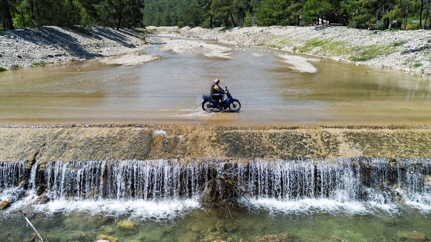 Kış aylarında etkili olan yağışlarla deredeki su seviyesi taşkın riski oluşturacak nitelikle yükseldi. Havaların ısınmasıyla deredeki su miktarı da giderek azalmaya başladı. Olimpos Deresi'ndeki son durum AA ekibince dronla görüntülendi. Derede kış mevsiminde yüksek olan su seviyesinin son günlerde çekildiği görüldü.