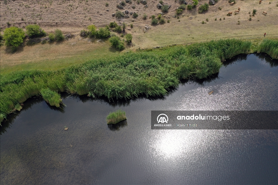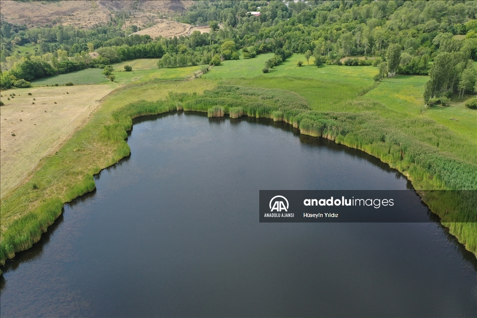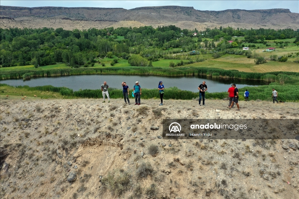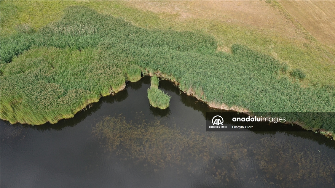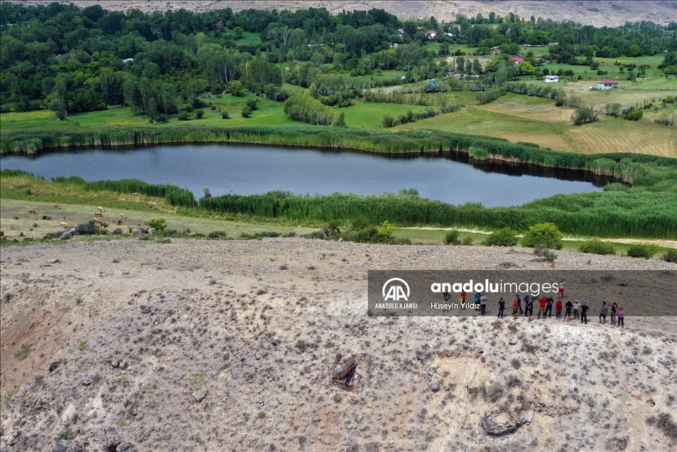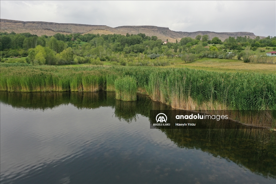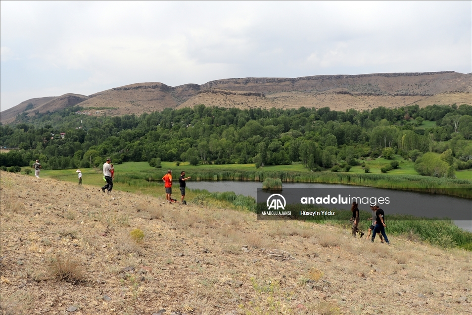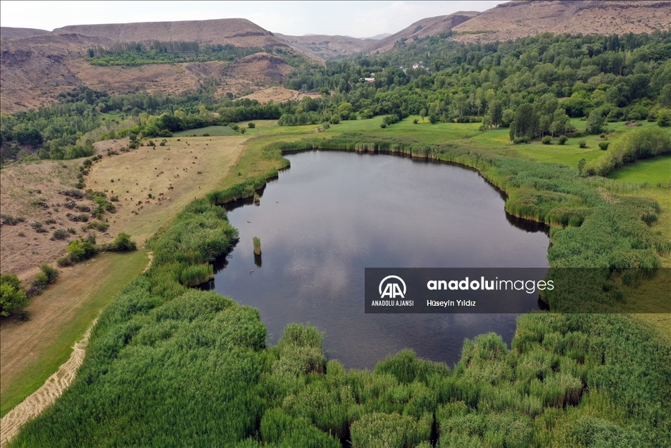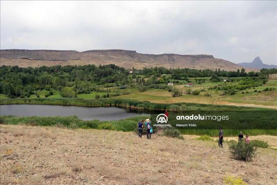 Iğdır'ın Tuzluca ilçesindeki Aras Dağları'nın eteklerinde bulunan ve etrafındaki bitki örtüsüyle dikkati çeken Üçkaya Gölü, ziyaretçilerden ilgi görüyor.
