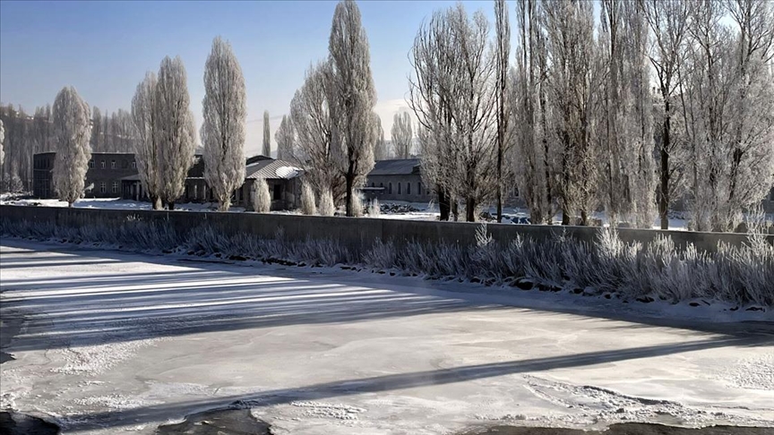 Ardahan'da soğuk nedeniyle ağaçlar kırağı ile kaplandı, yol ve kaldırımlarda buzlanma meydana geldi.