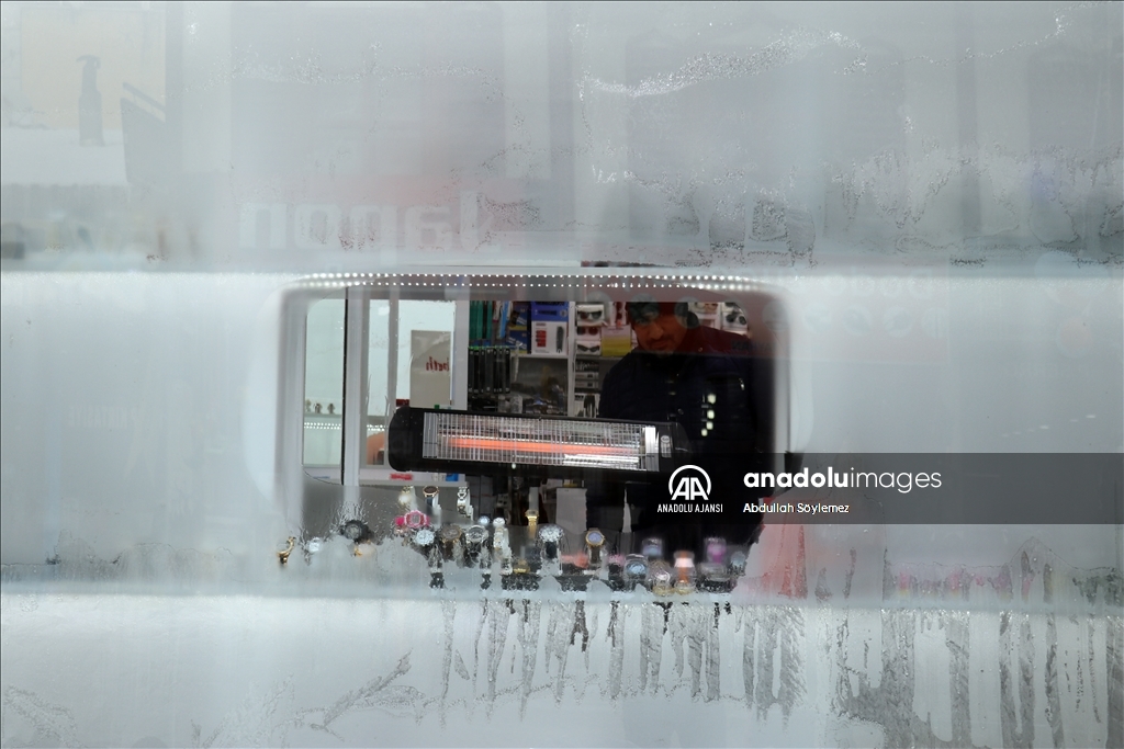 Esnaf, buz tutan iş yeri camlarını elektrikli ısıtıcıyla çözmeye çalıştı.