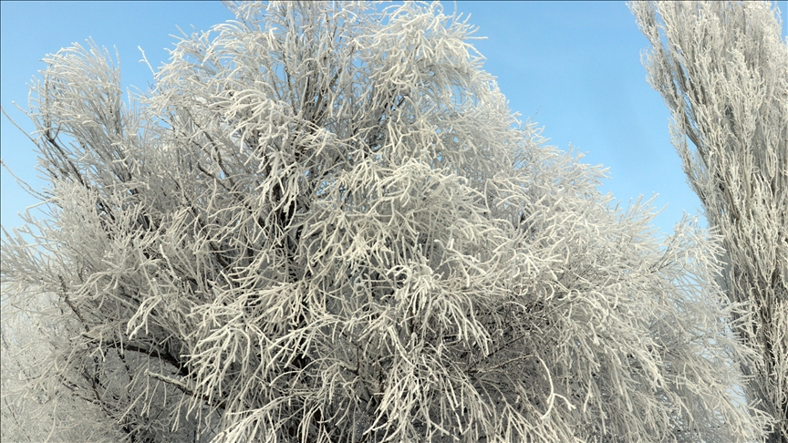 Ağaçların kırağı tutarak güzel manzaralar oluşturduğu kentte, park halindeki bazı tırların yakıt deposu dondu.