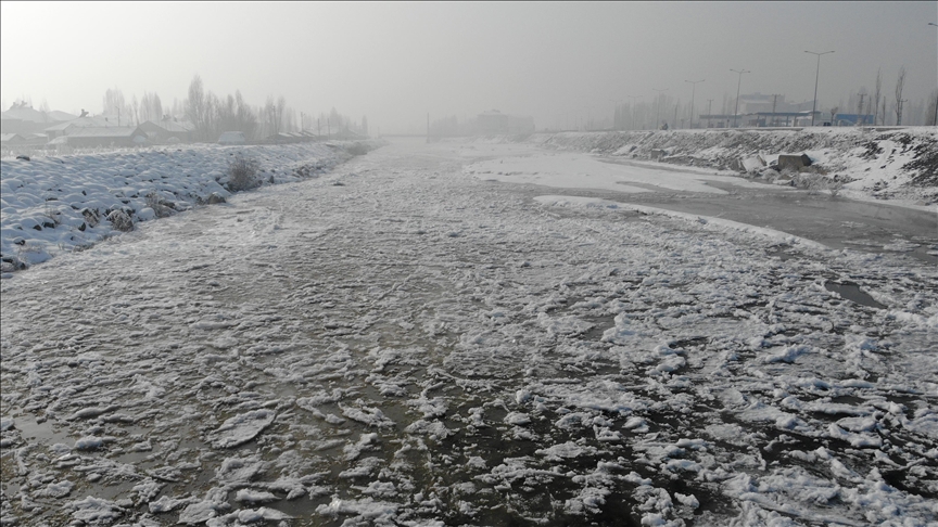 Ağrı'da da soğuk hava nedeniyle Murat Nehri ile derelerin yüzeyi buzla kaplandı.