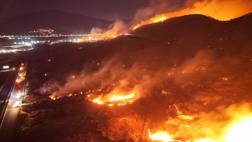 İhbar üzerine bölgeye İzmir Orman Bölge Müdürlüğüne bağlı 6 uçak, 5 helikopter, 25 arazöz, 9 su ikmal aracı ve 5 dozer sevk edildi.