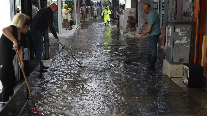 Tarihi Kemeraltı Çarşısı'nda da sağanak nedeniyle esnaf, suların dükkanlarına girmemesi için süpürge ve çekpas ile önlem aldı.