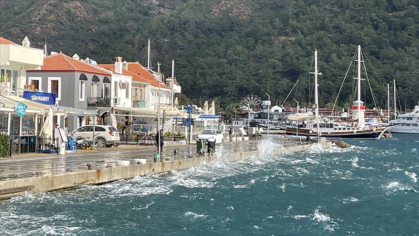 Marmaris Yatlimanı'nda, yükselen dalgalar kıyıdaki işletmelere kadar ulaştı.
