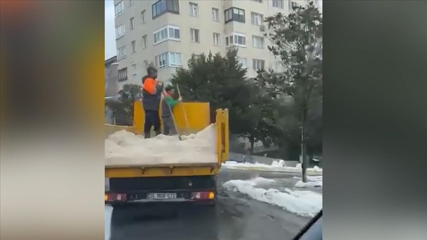 Fulya Mahallesi Aytekin Kotil Caddesi'nde kar yağışının ardından tuzlama çalışması yapan Şişli Belediyesi ekibi, kürekle park halindeki araçların üzerine tuz döktü.