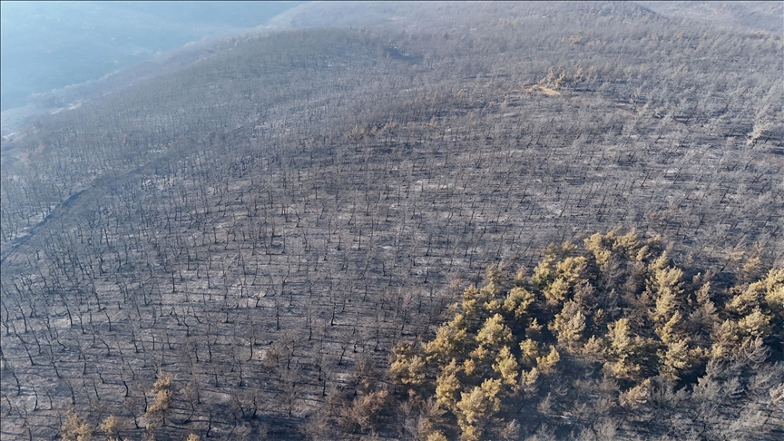 Büyük bölümü çam ormanı olan bölgede yanan alanlar AA ekiplerince dronla görüntülendi.