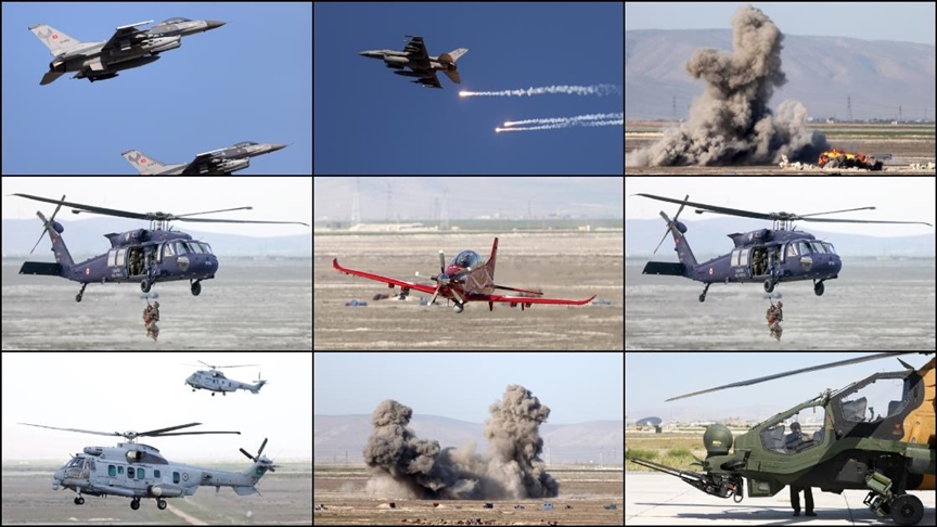 Anlık gelişmeler için AA Canlı Ardından, tatbikatta görev alan yerli ve yabancı katılımcı ülkelerin uçak ve helikopterleri gösterildi.