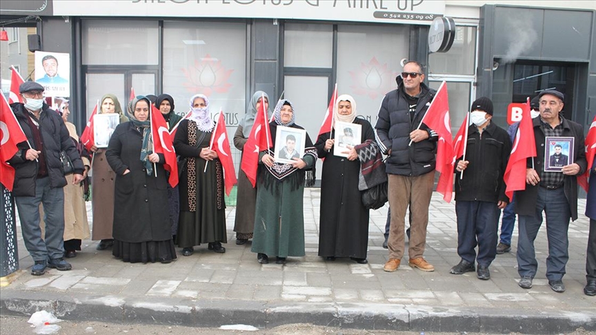 Menekşe Sokak'ta bir araya gelen aileler, "Evlat nöbetindeyiz", "Artık yeter, yakamızdan düşün", "Şehidime dokunma, onlar bize emanet", "Çocuklarımız kimsenin piyonu olmayacak" ve "Van anneleri evlat nöbetinde" yazılı dövizler taşıdı.