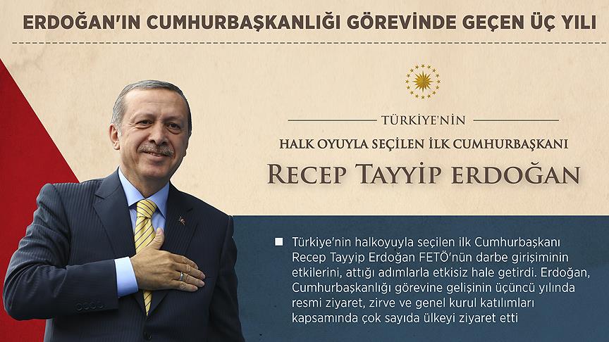Türkiye'nin halkoyuyla seçilen ilk Cumhurbaşkanı Recep Tayyip Erdoğan, görevinin "üçüncü" yılında Fetullahçı Terör Örgütü'nün (FETÖ) gerçekleştirdiği darbe girişiminin etkilerini, attığı adımlarla etkisiz hale getirdi. Erdoğan, anayasa değişikliği halk oylamasının ardından kurucusu olduğu AK Parti'nin genel başkanlığı görevine ikinci kez seçildi.