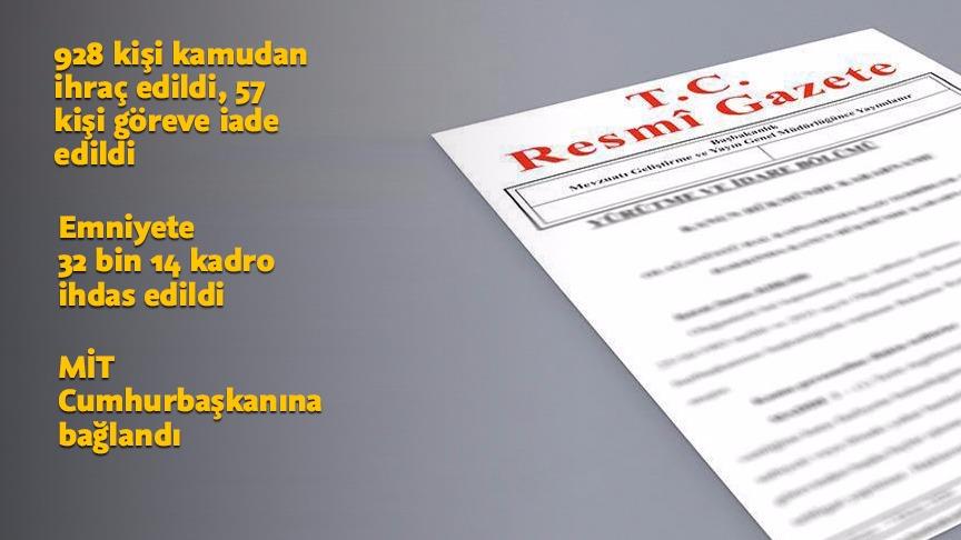 Buna göre, TBMM'den 5, Hakimler ve Savcılar Kurulundan 1, Atatürk Kültür, Dil ve Tarih Yüksek Kurumundan 1, Bankacılık Düzenleme ve Denetleme Kurumundan 1, Adalet Bakanlığı ve bağlı kuruluşlardan 142, Bilim, Sanayi ve Teknoloji Bakanlığından 12, Türk Standardları Enstitüsünden 9, KOSGEB'den 5, Türk Patent ve Marka Kurumundan 2, Şeker Kurumundan 1, Devlet Personel Başkanlığından 2, Türkiye İş Kurumundan 32, SGK'dan 1, Çevre ve Şehircilik Bakanlığından 2, Dışişleri Bakanlığından 4, Enerji ve Tabii Kaynaklar Bakanlığından 1, Türkiye Atom Enerjisi Kurumundan 1, Enerji Piyasası Düzenleme Kurumundan 2, Eti Maden İşletmeleri Genel Müdürlüğünden 1, Türkiye Elektrik Dağıtım AŞ'den 1, Elektrik Üretim AŞ'den 1, Türkiye Petrolleri Anonim Ortaklığı Genel Müdürlüğünden 1, Gıda, Tarım ve Hayvancılık Bakanlığından 4, Tütün ve Alkol Piyasası Düzenleme Kurumundan 1, Tarım ve Kırsal Kalkınmayı Destekleme Kurumundan 10, Toprak Mahsulleri Ofisinden 2, İçişleri Bakanlığından 29, Emniyet Genel Müdürlüğünden 12, Göç İdaresi Genel Müdürlüğünden 4, Kamu Düzeni ve Güvenliği Müsteşarlığından 1, mahalli idarelerden 166, Sahil Güvenlik Komutanlığından 3, Kültür ve Turizm Bakanlığından 6, Milli Eğitim Bakanlığından 7, Milli Savunma Bakanlığından 19, Genelkurmay Başkanlığından 1, Kara Kuvvetleri Komutanlığından 106, Deniz Kuvvetleri Komutanlığından 40, Hava Kuvvetleri Komutanlığından 59, Makina ve Kimya Endüstrisi Kurumundan 3, Orman ve Su İşleri Bakanlığı ile bağlı kuruluşlardan 43, Karayolları Genel Müdürlüğünden 3, Türkiye Vagon Sanayi AŞ'den 1, Kıyı Emniyeti Genel Müdürlüğünden 1, Bilgi Teknolojileri ve İletişim Kurumundan 7, yükseköğretim kurumlarından 120 akademik personel ile 52 idari personel için ihraç kararı verildi.
