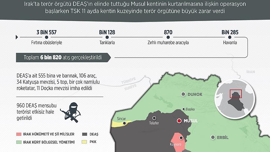 Irak’ta terör örgütü DEAŞ’ın elinde tuttuğu Musul kentinin kurtarılmasına ilişkin operasyon başlarken Türk Silahlı Kuvvetleri (TSK) 11 ayda kentin kuzeyindeki terör örgütüne büyük zarar verdi.