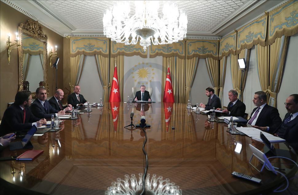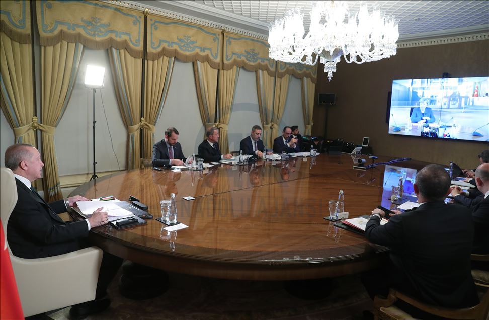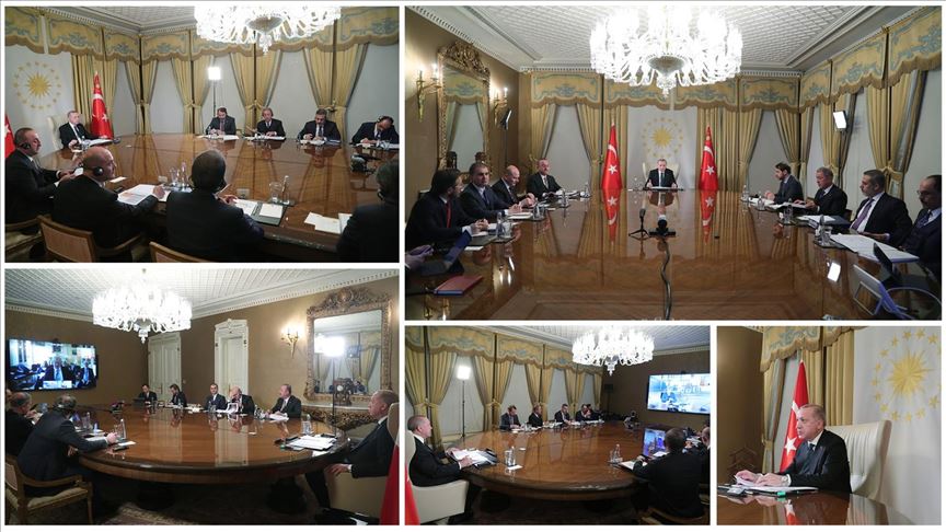 Video konferans görüşmesinde, Dışişleri Bakanı Mevlüt Çavuşoğlu, İçişleri Bakanı Süleyman Soylu, Hazine ve Maliye Bakanı Berat Albayrak, Milli Savunma Bakanı Hulusi Akar, MİT Başkanı Hakan Fidan, İletişim Başkanı Fahrettin Altun, Cumhurbaşkanlığı Sözcüsü İbrahim Kalın ile AK Parti Sözcüsü Ömer Çelik de hazır bulundu.