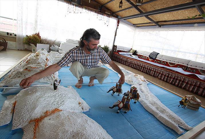 "Evimi bir atölyeye çevirdim. Burada her şeyi kendim tasarlıyorum ve yapıyorum. Filinden, fillerin üzerindeki giysilerine kadar, Yıldırım’ın ordusundaki gruplardan Timur’un ordusundaki birliklere kadar, bu birliklerin giysilerinden, şekillerine, bayraklarına, tuğralarına, atlarının zırhlarına kadar bulduğum belgelerdeki her şeyi makete döktüm. Maketi tamamlayabilmek için son altı ay içerisinde eşim ve çocuklarımla birlikte gece saat 03.00’e kadar çalışıyorum."