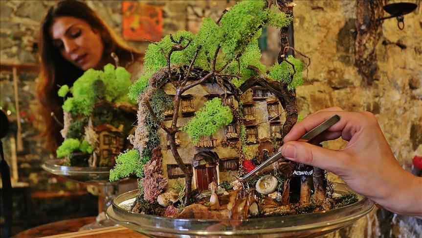 Yılmaz, teraryuma Altınoluk sayesinde ilgi duyduğunu dile getirerek, "Eşim buralı olduğu için yıllar önce buraya geldiğimizde Kazdağları'na çıktık, tabiatına, kuşlarına, bitki örtüsüne aşık oldum. Gezerken değişik objeler de toplamaya başladım. Burada bulduğum kırık ampulün içine ilk çalışmamı yaptım." diye konuştu.