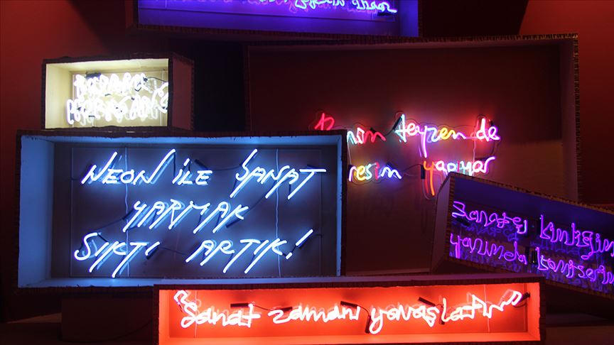 Sanatçıların üretim aşamasında karşılaştıkları absürt kelimelerden ve cümlelerden yola çıkarak hazırladıkları sergiye dair AA muhabirine açıklamalarda bulunan Ardan Özmenoğlu, bu cümleleri sanatçıların kendi el yazılarıyla neon eserlere dönüştürdüklerini söyledi.