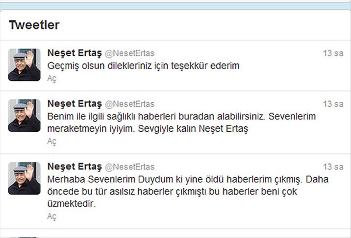 Sanatçı Neşet Ertaş, sağlık durumuna ilişkin sosyal paylaşım sitelerinde çıkan olumsuz haberler yer alması üzerine, resmi Twitter hesabı üzerinden takipçilerine, ''Merhaba sevenlerim, duydum ki yine öldü haberlerim çıkmış. Daha öncede bu tür asılsız haberler çıkmıştı, bu haberler beni çok üzmektedir. Benim ile ilgili sağlıklı haberleri buradan alabilirsiniz. Sevenlerim merak etmeyin iyiyim. Sevgiyle kalın'' mesajını paylaştı.