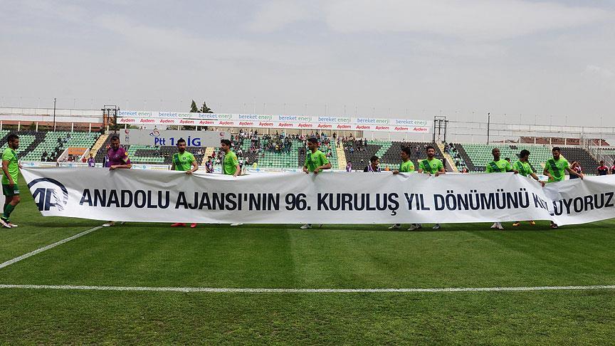 Mavi-siyahlı futbolcular, sahaya çıkarken "Anadolu Ajansı'nın 96. kuruluş yıl dönümünü kutluyoruz" yazılı pankartı taşıdı.