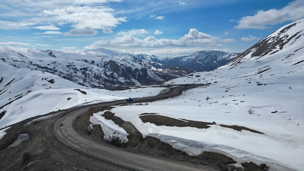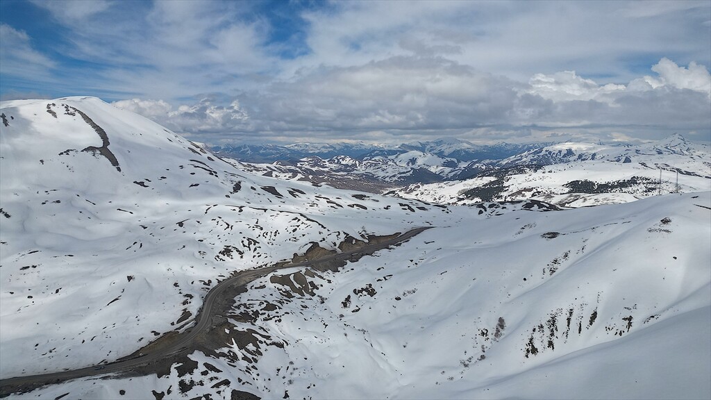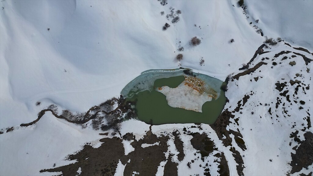 Bayburt’ta etkisini sürdüren kar yağışının ardından karla kaplanan dağlar dronla görüntülendi. Bölgede karların erimesi sonucu oluşan göl güzel manzara sundu.