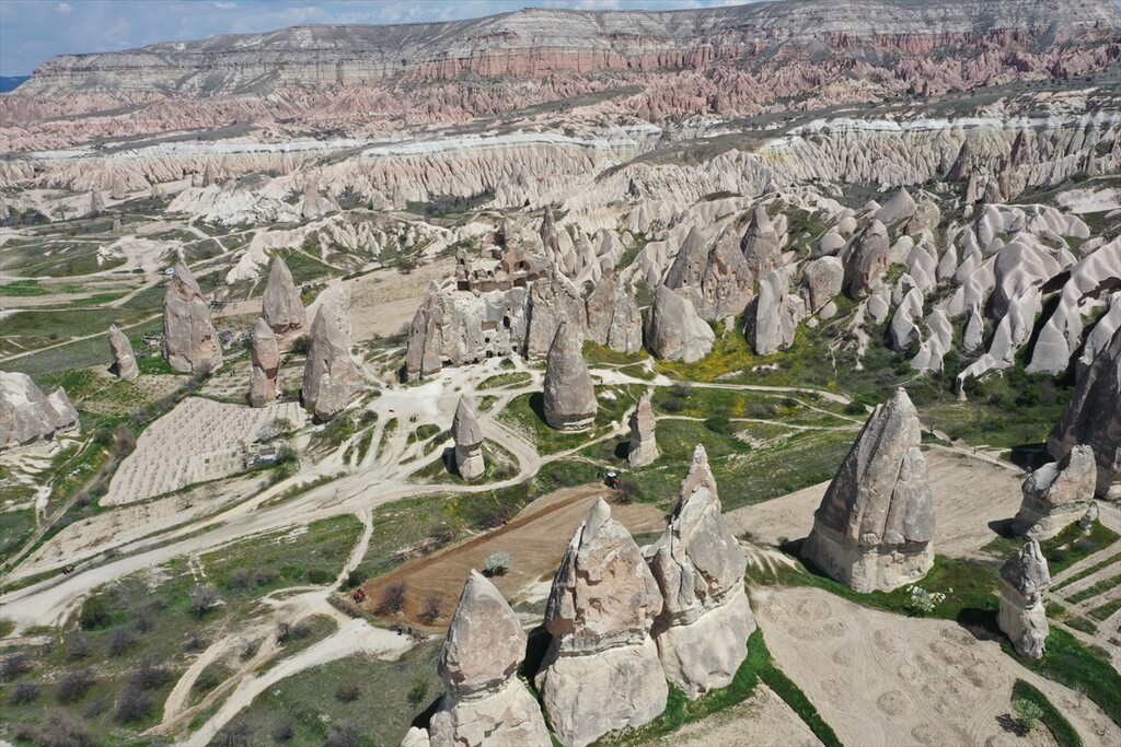 Kapadokya'da peribacaları baharda çiçeklerle buluştu