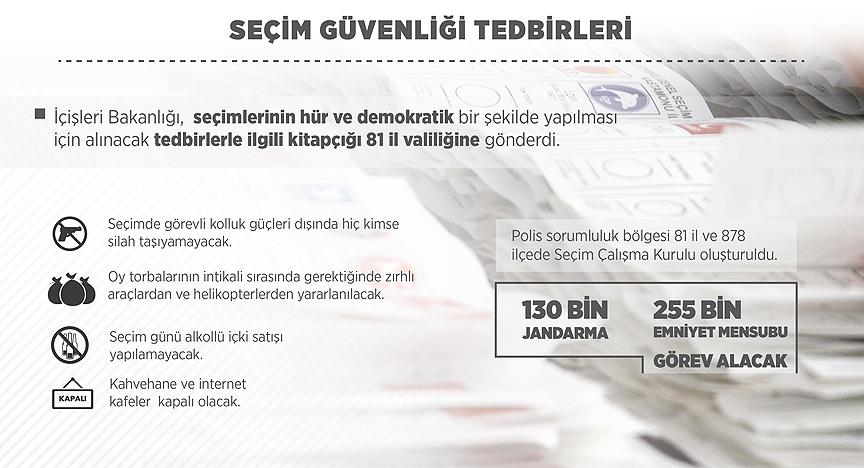 İçişleri Bakanlığı, hazırladığı seçim tedbirleri ile ilgili kitapçığı, 81 ilin valiliklerine gönderdi. Seçimlerin huzur ve güven ortamı içerisinde gerçekleşmesi için gerekli her türlü tedbirin planlandığı ve uygulamasının titizlikle yürütüleceği bildirildi.