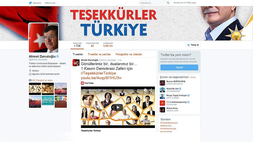 Davutoğlu, #TeşekkürlerTürkiye başlığıyla, AK Parti'nin 2011 seçimlerinde kullandığı reklam filmini paylaştı. Reklamın sonunda Başbakan Ahmet Davutoğlu'nun sesiyle "Teşekkürler Türkiye" ifadesi yer aldı.
