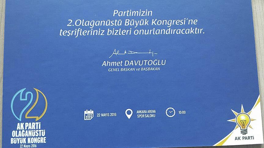 Davetiyenin bir yüzünde "Partimizin 2. Olağanüstü Büyük Kongresi'ne teşrifleriniz bizleri onurlandıracaktır" yazısı ve altında Davutoğlu'nun imzası bulunuyor. Kongrenin 22 Mayıs 2016 günü Ankara Arena Spor Salonu'nda gerçekleştirileceği ve saat 10.00'da başlayacağı belirtiliyor. Davetiyenin diğer tarafında AK Parti'nin amblemi yer alıyor.