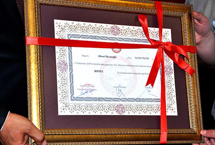 25. Dönem Milletvekili Genel Seçimi'nde Konya'dan milletvekili seçilen Başbakan Ahmet Davutoğlu'nun mazbatası, vekaletini verdiği AK Parti Konya İl Başkanı Musa Arat'a takdim edildi.