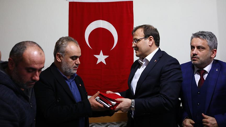 Konuşmanın ardından şehit babası Mustafa Aygül, Başbakan Yardımcısı Çavuşoğlu tarafından kendisine verilen Türk bayrağını öperek teslim aldı.