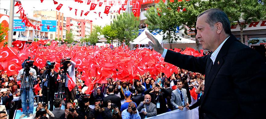 Cumhurbaşkanı Erdoğan, "Diyorlar ki 'Cumhurbaşkanı taraf.' Evet tarafım. Ama ben milletin tarafındayım. Millet neredeyse oradayım. Her partiye de eşit mesafedeyim. Ama gönlümde bir parti var tabii. O ayrı bir konu. Bu meydanda herhangi bir partinin pankartı yok. Bu meydanda sadece Türk bayrağı dalgalanıyor" ifadelerini kullandı.