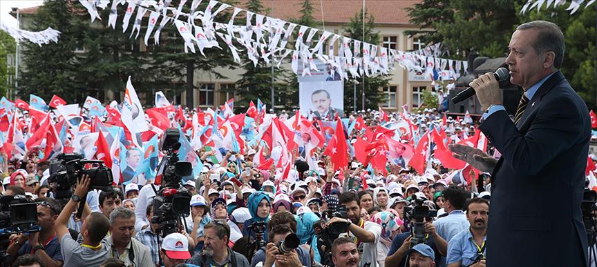 10 Ağustos'ta cumhurbaşkanı seçimlerinin olduğunu anımsatan Erdoğan, ''Milletimiz için, ülkemiz için bir gurur vesilesi. Türkiye, duble yollar inşa ederken, hızlı tren hatları inşa ederken, okullar, üniversiteler, hastaneler, barajlar inşa ederken, demokrasi ve özgürlük alanındaki ilkleri gerçekleştiriyor. Araçlar için nasıl otoyollar inşa ediyorsak, demokrasi otobanını da dünyanın en ileri standartlarına kavuşturmanın mücadelesini veriyoruz'' diye konuştu.