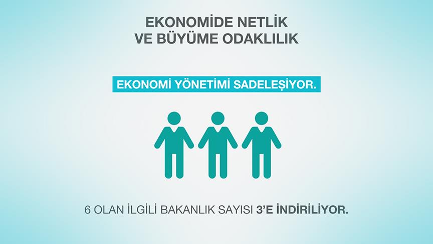 Ekonomi alanında 6 olan ilgili bakanlık sayısının 3'e indirilmesi planlanıyor. Bu kapsamda, 16 yılda 3 kattan fazla artan milli geliri vizyon projeler, ekonomik canlılık, istihdam, bilgi ve toplumsal fayda üreterek yeniden katlama hedefiyle oluşturulan sistemde ekonomi yönetimi sadeleşecek.