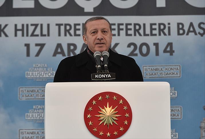 Konya'da yüksek hızlı tren seferlerini başlatacaklarını bildiren Cumhurbaşkanı Erdoğan, "Onlar 'basın özgürlüğü' deyip timsah göz yaşı dökecekler, onlar 'yolsuzluk' deyip iftira atacaklar, onlar darbelere kol kanat gerecekler, onlar Türkiye düşmanlarıyla iş tutacaklar. Ama biz işimizi yapacak, milletimize hizmet üretmeye devam edeceğiz" diye konuştu.