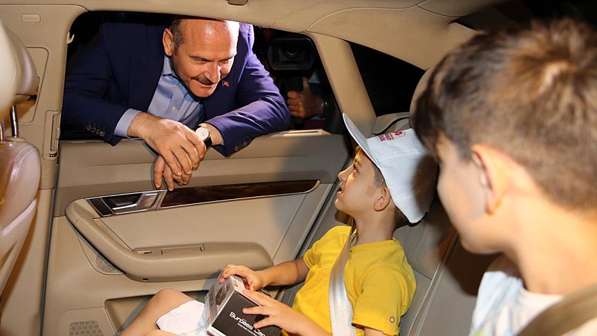 Trafik uygulaması kapsamında durdurulan araçlardaki sürücü ve yolcularla bir süre sohbet ederek bayramlaşan Soylu, çocuklara ise "kırmızı düdük" hediye etti.
