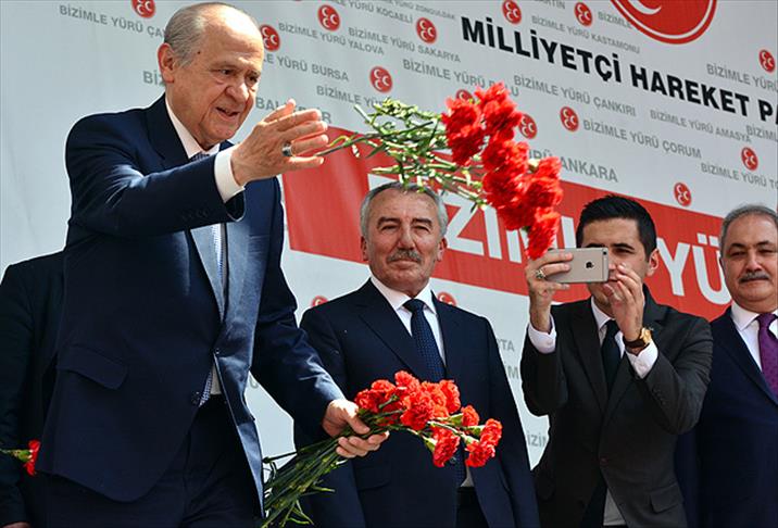 MHP Genel Başkanı Devlet Bahçeli, "Türkiye ilk defa makamını kötüleyen, partisi için oy istemek yerine sahibine çalışan ve koltuğunun altına başkanlık dinamiti döşeyen bir başbakana şahit oldu. Türk milleti ilk kez kendisi olmayan kendi gibi davranmayan, kopyacı, mütegallibe hayranı, müflislikle anılan, etkisiz, yetkisiz ezik bir başbakan gördü" dedi.