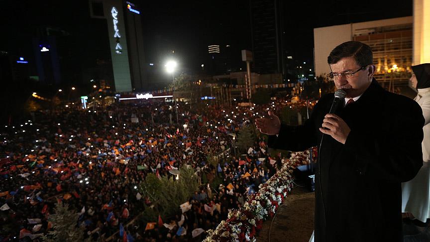AK Parti Genel Başkanı ve Başbakan Ahmet Davutoğlu yaptığı konuşmada, "Sizler, ülkemiz üzerinde oynanan oyunları gördünüz ve bu oyunları bozdunuz. Biz 'buradayız, burada olacağız, kıyamete kadar buradayız' dediniz. Sizler, o sandıklara sadece eski Türkiye'nin partilerini değil, eski Türkiye'nin zihniyetini, kaosu, şiddeti, terörü, istikrarsızlığı gömdünüz." ifadelerini kullandı.